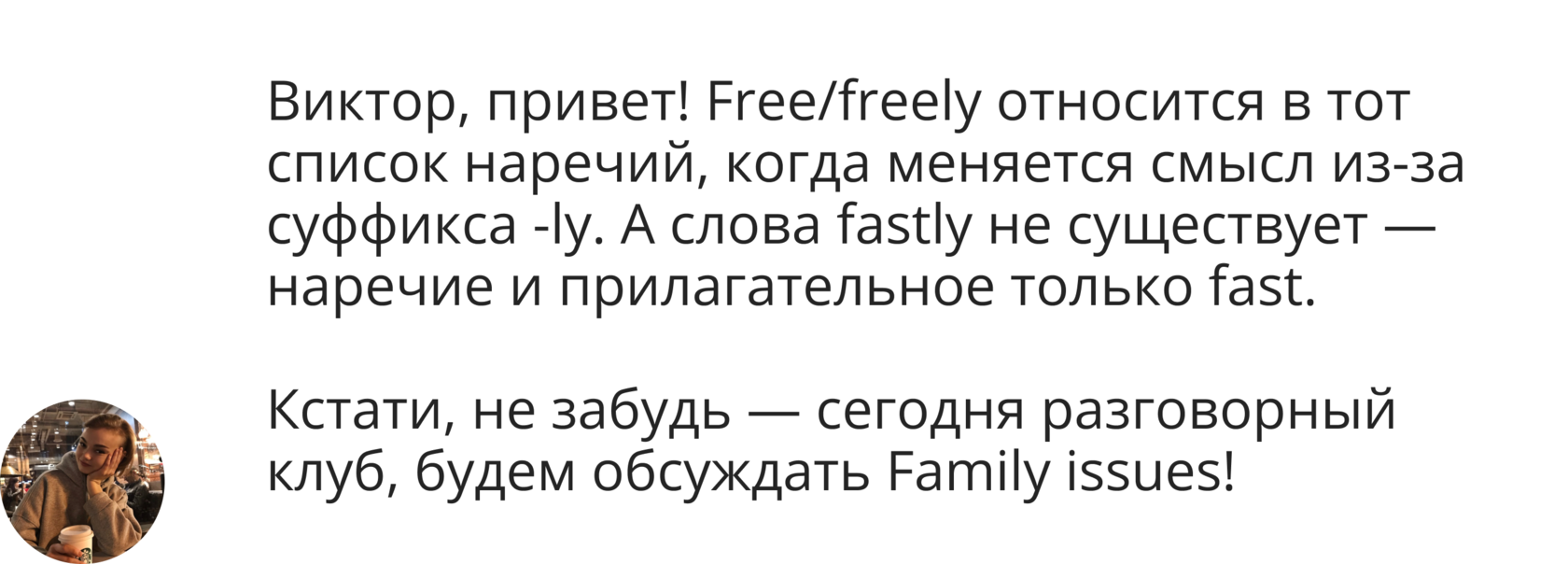 Добавим в неформальный чат со студентами и преподавателями, где можно спросить про английский и не только